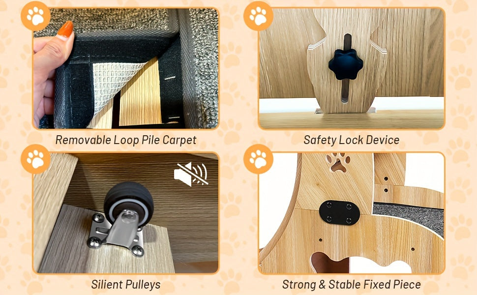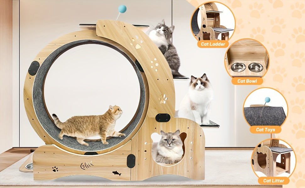 Rueda de ejercicio para gatos 4 en 1. Diseñada para mantener a los gatos interiores activos, saludables y entretenidos. Este modelo en particular tiene varias características pensadas para que sea un equipo seguro, silencioso y funcional para tu mascota.